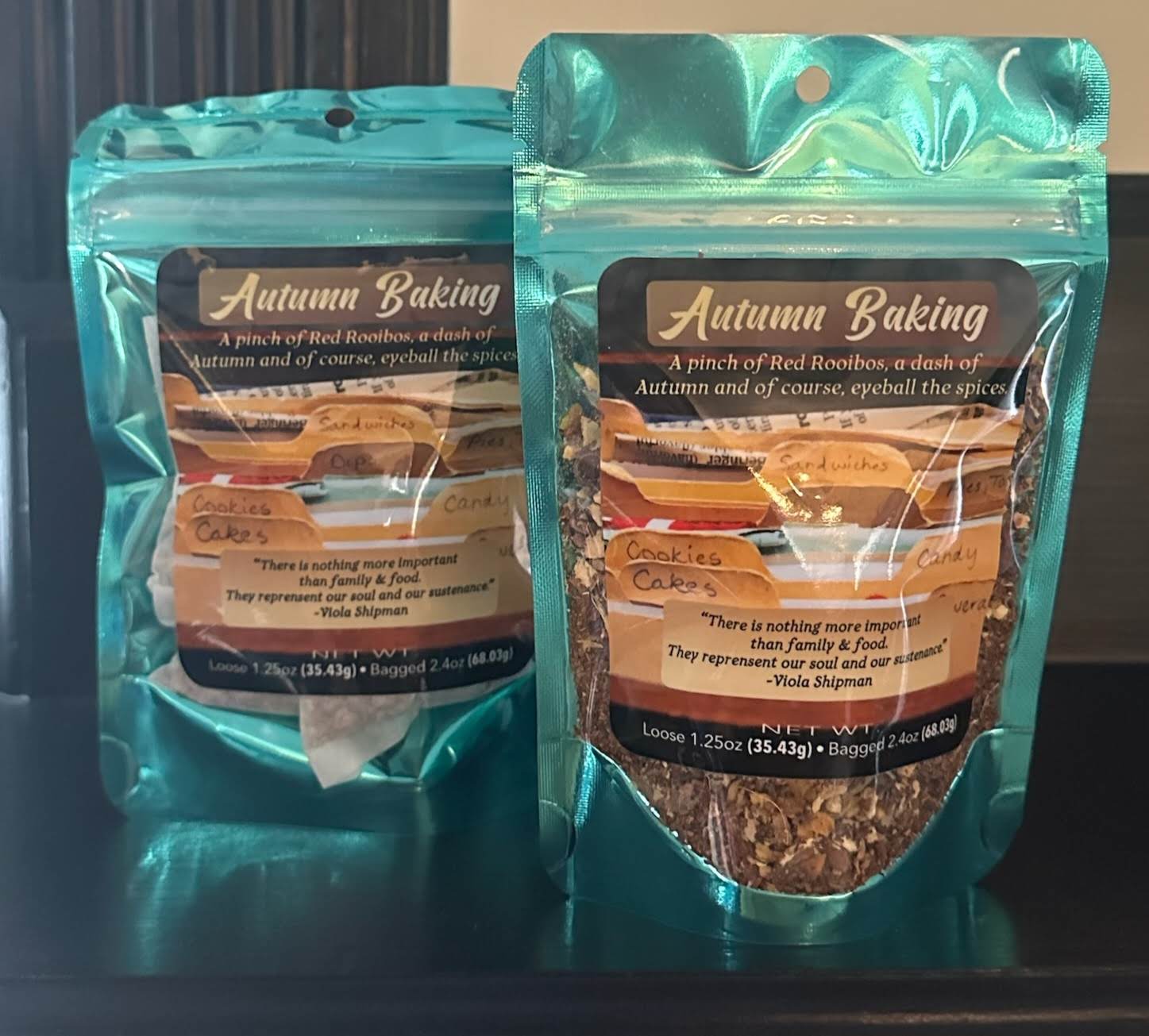 Red Rooibos tea is the perfect bass note for this flavorful, mellow tea. Autumn spices are blended to perfection to give you a warm hug in a mug. Apple Pie, Cinnamon Rolls and a cup of Autumn Baking Tea. Curl up with a good book and you have the perfect caffeine free, Autumn Day.